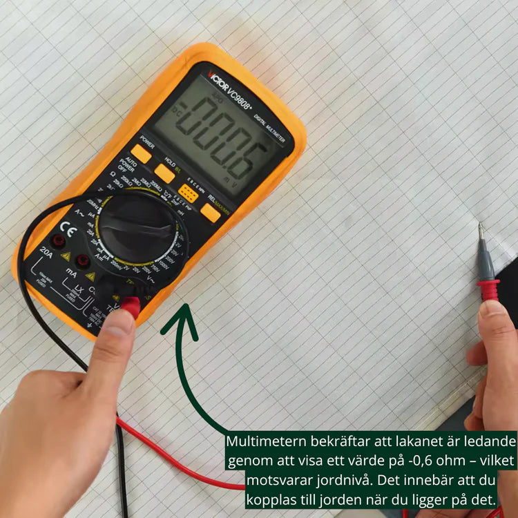 Lakanet ansluter till jorden via ditt hems elektriska system, som är jordat via en jordningsstav. Det möjliggör att vara jordad så länge du ligger på lakanet